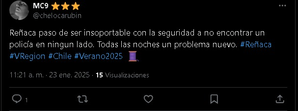 “Reñaca pasó de ser insoportable con la seguridad a no encontrar un policía en ningun lado. Todas las noches un problema nuevo”, publicó en sus redes sociales.