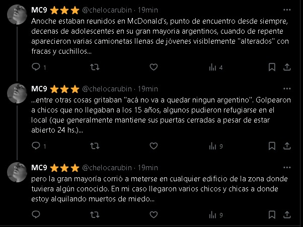 “Anoche estaban reunidos en McDonald’s, punto de encuentro desde siempre, decenas de adolescentes en su gran mayoria argentinos, cuando de repente aparecieron varias camionetas llenas de jóvenes visiblemente ‘alterados’ con fracas y cuchillos“, relató el fotógrafo, visiblemente molesto por lo ocurrido en el vecino país.
