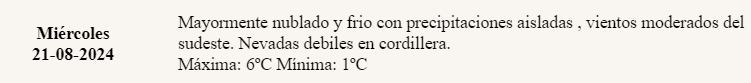 Además, pronosticaron “vientos moderados del sudeste” y “nevadas debiles en cordillera”.