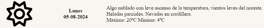 Además, pronosticaron la llegada de “vientos leves del noreste”, “heladas parciales” y “nevadas en cordillera”.