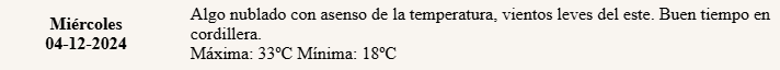 Además, pronosticaron la llegada de “vientos leves del Este” y “buen tiempo en cordillera”.