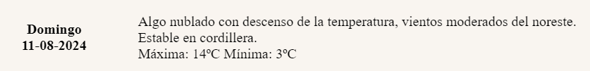 Además, los voceros pronosticaron una jornada “algo nublada” y adelantaron la llegada de “vientos moderados del noreste” y estabilidad en cordillera.