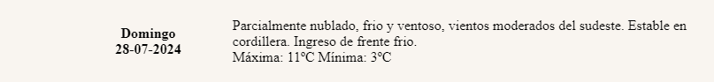 Al mismo tiempo, voceros el organismo local indicaron que estará “estable en la zona de cordillera” y se espera por un “ingreso de frente frio” en la provincia.