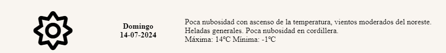 Por otro lado, también vaticinaron la llegada de vientos moderados del noreste y heladas generales, con nubosidad en cordillera.