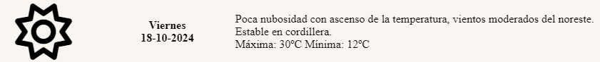 Además, podrían registrarse “vientos moderados del noreste” y estabilidad en cordillera. En cuanto a la máxima, la misma no superaría los 30 grados.