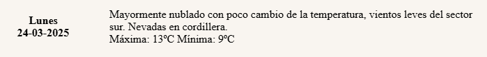 Además, anunciaron la llegada de “vientos leves del sector sur” y “nevadas en cordillera”. En cuanto a la máxima, indicaron que la misma no superaría los 13 grados.