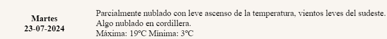 Además, anunciaron la llegada de “vientos leves del sudeste” y cierta nubosidad en cordillera. En cuanto a la máxima, indicaron que la misma podría llegar a los 19 grados.