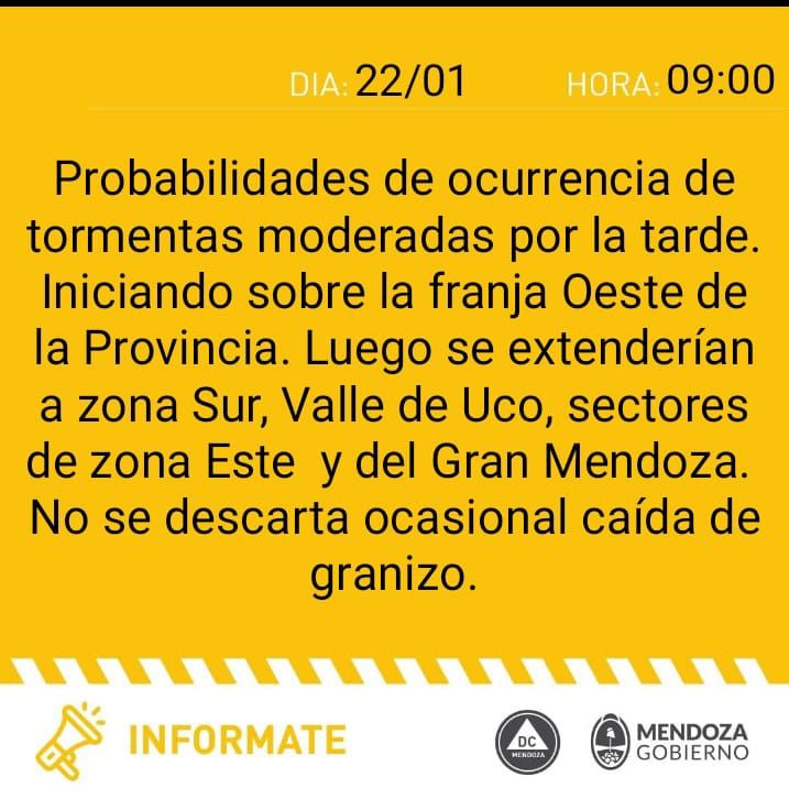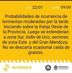 “Probabilidades de ocurrencia de tormentas moderadas por la tarde. Iniciando sobre la franja Oeste de la provincia”, comunicaron desde el organismo. “Luego se extenderían a zona Sur, Valle de Uco, sectores de zona Este y del Gran Mendoza”.