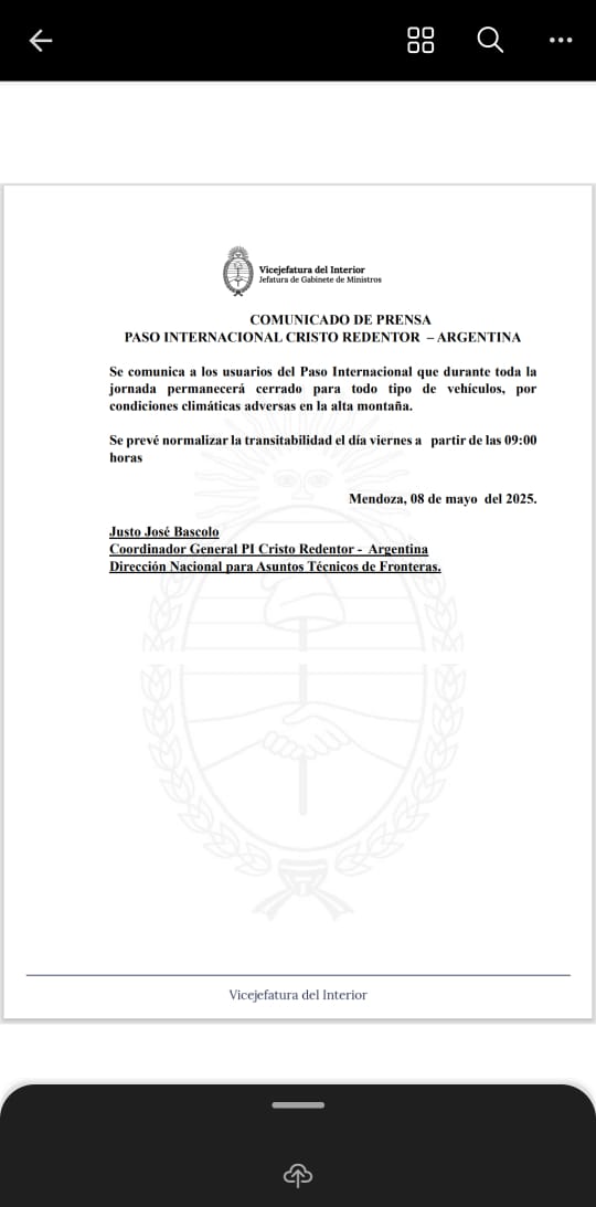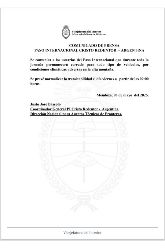 La medida responde a condiciones climáticas adversas en la alta montaña, que impiden garantizar la seguridad de los usuarios. El comunicado fue emitido por Justo José Bascolo, Coordinador General del PI Cristo Redentor, quien señaló que la reapertura del paso está prevista para el viernes 9 de mayo a las 9:00 horas, siempre que mejoren las condiciones meteorológicas.