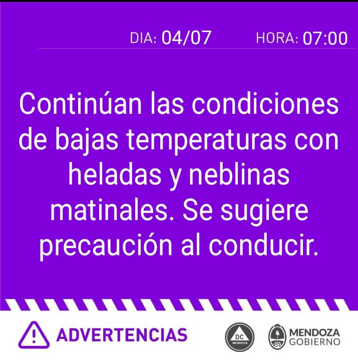 Desde Defensa Civil emitieron una advertencia para este jueves. Según lo informado, “continúan las condiciones de bajas temperaturas con heladas y neblinas matinales”.