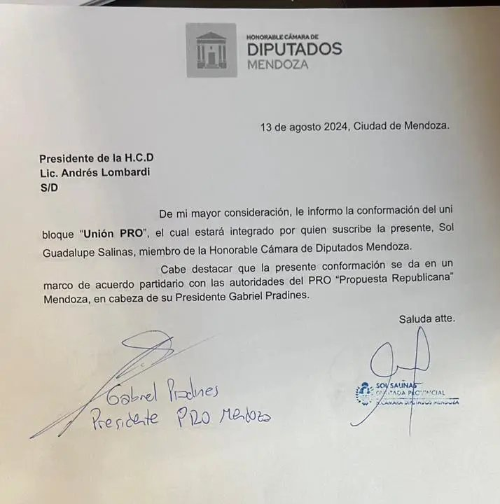 La diputada provincial Sol Salinas, que hasta recientemente respaldó políticamente al sector del PRO encabezado por Hebe Casado en Mendoza, dio los motivos por los cuales decidió darle forma al bloque “Unión PRO”.