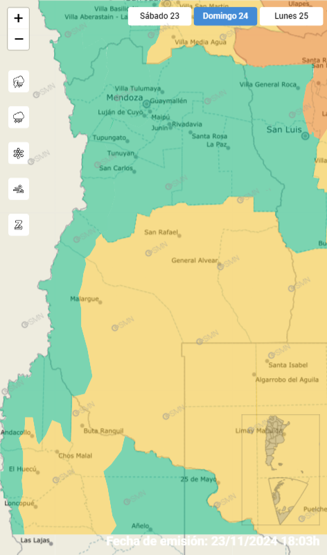 Para la jornada de este domingo 24 de noviembre, desde el Servicio Meteorológico Nacional (SMN) emitieron dos alertas por tormentas y viento Zonda que afectarán parte de Mendoza.