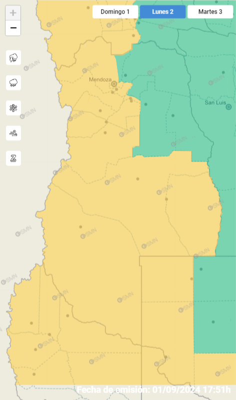 Dicha alerta afectará la zona cordillerana (Las Heras y Luján de Cuyo), Junín, Rivadavia, Valles de San Carlos, Tunuyán y Tupungato, Capital, Godoy Cruz, Guaymallén, Maipú y el sur de Mendoza.