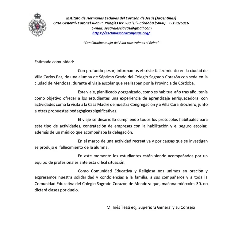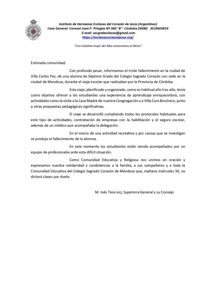 “Con profundo pesar, informamos el triste fallecimiento en la ciudad de Villa Carlos Paz, de una alumna de Séptimo Grado del Colegio Sagrado Corazón con sede en la ciudad de Mendoza, durante el viaje escolar que realizaban por la Provincia de Córdoba”, comienza el escrito.