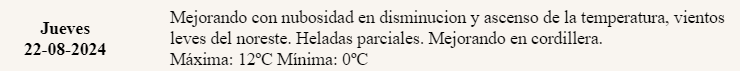 De acuerdo a lo difundido por voceros del organismo provincial, se espera un jueves con un mejoramiento de las condiciones meteorológicas, y “con nubosidad en disminución y ascenso de la temperatura”.