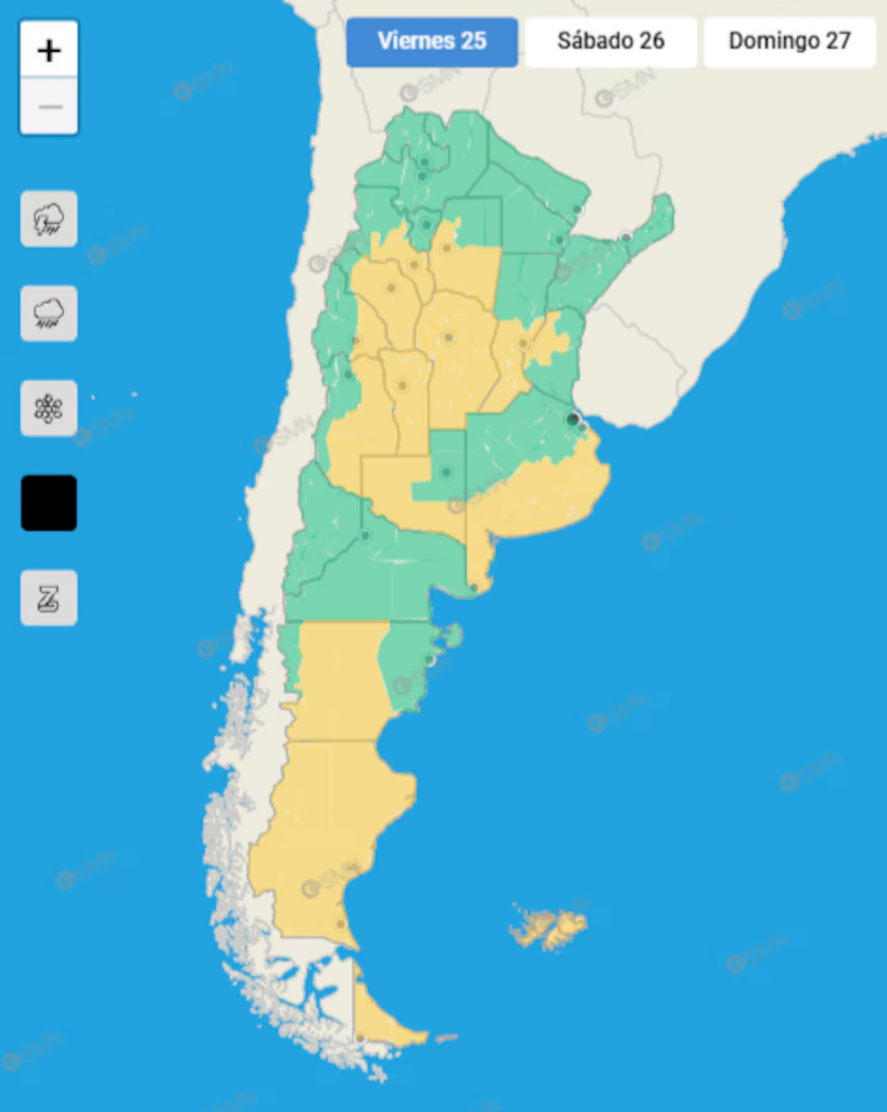 Por otra parte, en el sur del país podrían darse vientos del sudoeste con velocidades de entre 40 y 60 km/h, y ráfagas que pueden superar los 100 km/h. Entre las provincias bajo esta alerta aparecen: