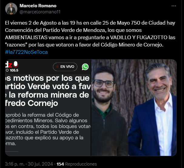 Otro de los que también espera la convención es el histórico Marcelo Romano, ex senador y candidato a intendente de San Carlos. “El viernes 2 de Agosto a las 19 hs en calle 25 de Mayo 750 de Ciudad hay Convención del Partido Verde de Mendoza, los que somos AMBIENTALISTAS vamos a ir a preguntarle a VADILLO Y FUGAZOTTO las ‘razones’ por las que votaron a favor del Código Minero de Cornejo“, posteó en sus redes.