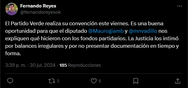 El propio Reyes, a través de su cuenta de “X”, empezó a palpitar un encuentro picante: “El Partido Verde realiza su convención este viernes. Es una buena oportunidad para que el diputado Mauro Giambastiani y Mario Vadillo nos expliquen qué hicieron con los fondos partidarios“.
