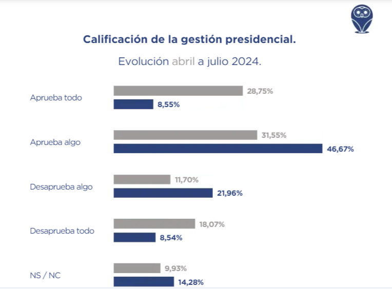 Según los datos recopilados, aquellos que aprueban totalmente la gestión de Milei cayó drásticamente del 28,75% en abril al 8,55% en julio. En contraste, el grupo que aprueba parcialmente las acciones del presidente ha aumentado significativamente, pasando del 31,55% al 46,76%