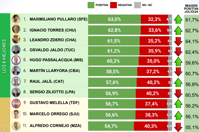 El primer lugar lo ocupa Maximiliano Pullaro de Santa Fe con un 63.0% de aprobación, seguido de cerca por Ignacio Torres de Chubut con un 62.8%. Leandro Zdero de Chaco cierra el podio con un 61.5% de imagen positiva.