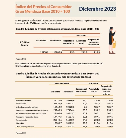 La Dirección de Estadísticas e Investigaciones Económicas de Mendoza (DEIE) publicó este jueves los datos de la inflación de diciembre 2023 en la provincia y dejó números alarmantes.