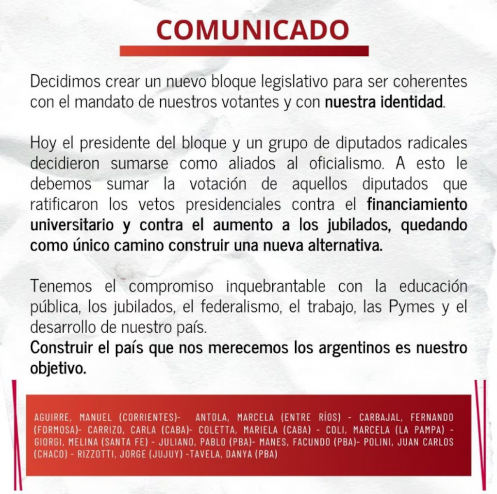 “Hoy el presidente del bloque y un grupo de diputados radicales decidieron sumars como aliados al oficialismo. A esto le debemos sumar la votación de aquellos diputados que ratificaron los vetos presidenciales contra el financiamiento y contra el aumento a los jubilados, quedando como único camino construir una nueva alternativa“, agregaron.