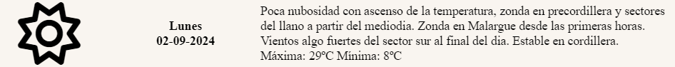Para el departamento sureño de Malargüe adelantaron “Zonda desde las primeras horas” y “vientos algo fuertes del sector sur a final del día”.