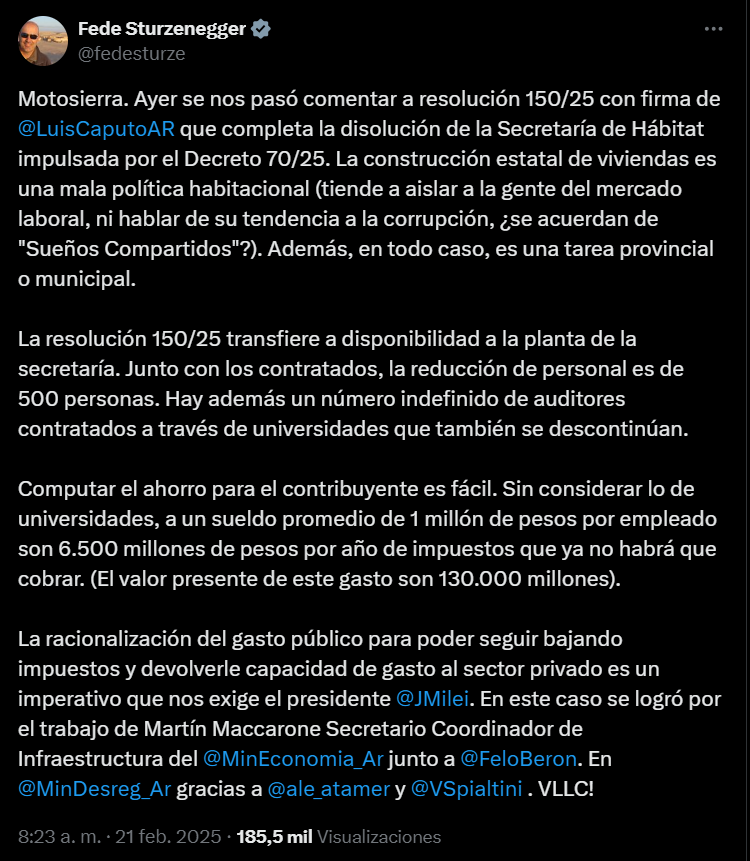 El ministro de Desregulación y Transformación del Estado, Federico Sturzenegger, confirmó la decisión en su cuenta de X, donde explicó que el recorte incluye tanto a empleados de planta como a contratados, totalizando 500 personas afectadas. Además, reveló que se dará de baja un número indeterminado de auditores contratados a través de universidades.