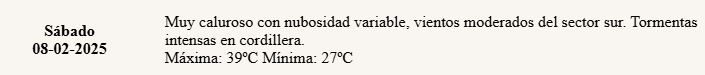 Además, pronosticaron la llegada de “vientos moderados del sector sur” y “tormentas intensas en cordillera”.