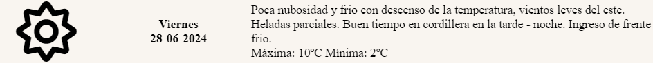 Además, adelantaron la llegada de “vientos leves del Este” y “heladas parciales”. Por otra parte, pronosticaron un mejoramiento del tiempo en la zona de cordillera en horas de la tarde – noche.