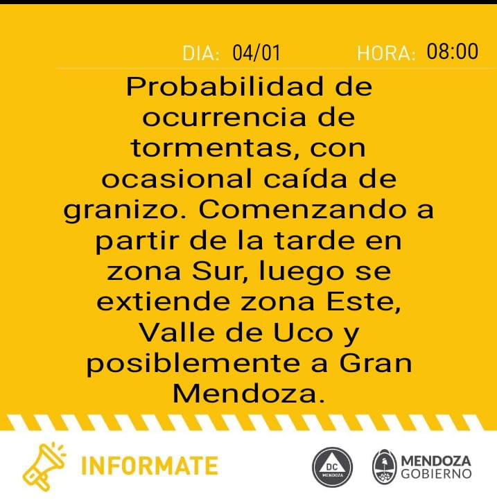 Y agregaron que comenzará a partir de la tarde “en zona Sur, luego se extiende a zona Este, Valle de Uco y posiblemente a Gran Mendoza”.