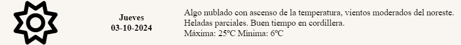 Por otra parte, pronosticaron “buen tiempo en cordillera” y una máxima que no superaría los 25 grados.