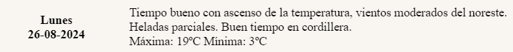 Además, pronosticaron “vientos moderados del noreste” y “heladas parciales”. Por otra parte, adelantaron “buen tiempo en cordillera” y una máxima que no superaría los 19 grados.