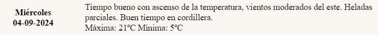 Además, adelantaron la llegada de “vientos moderados del Este” y “heladas parciales”. Por otra parte, pronosticaron “buen tiempo en cordillera” y una máxima que podría llegar a los 21 grados.