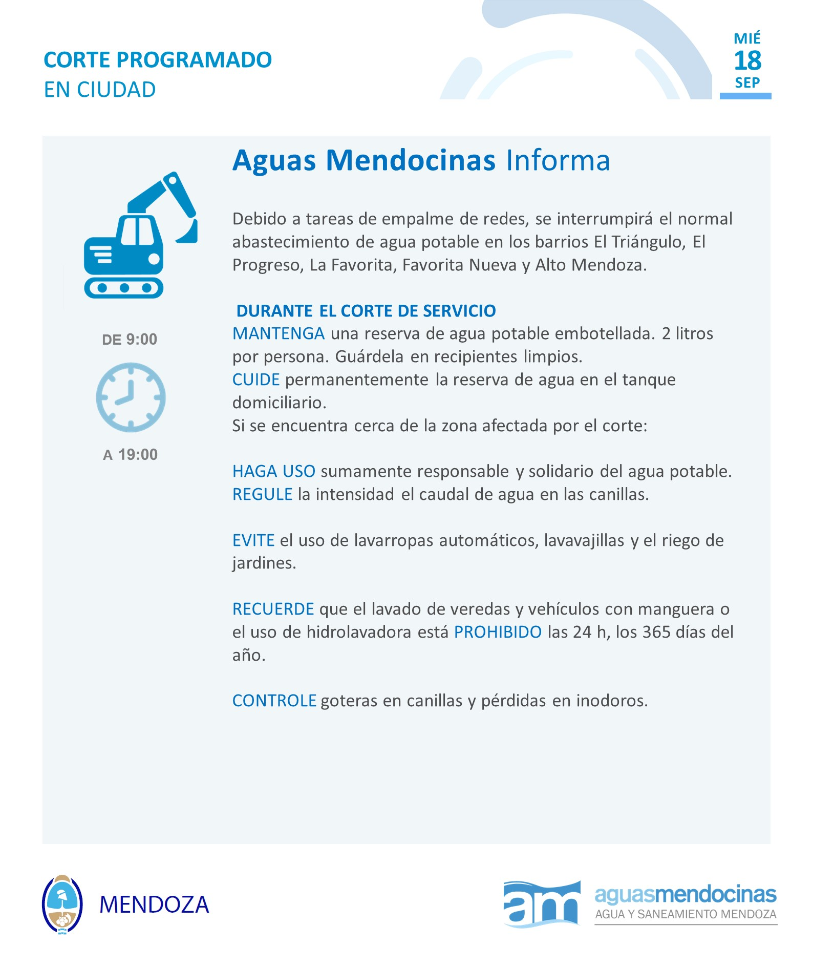 “Debido a tareas de empalme de redes, se interrumpirá el normal abastecimiento de agua potable en los barrios El Triángulo, El Progreso, La Favorita, Favorita Nueva y Alto Mendoza“, detallaron los voceros.