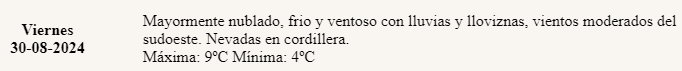De acuerdo a lo difundido por voceros del organismo, se espera un día “mayormente nublado, frío y ventoso con lluvias y lloviznas”.