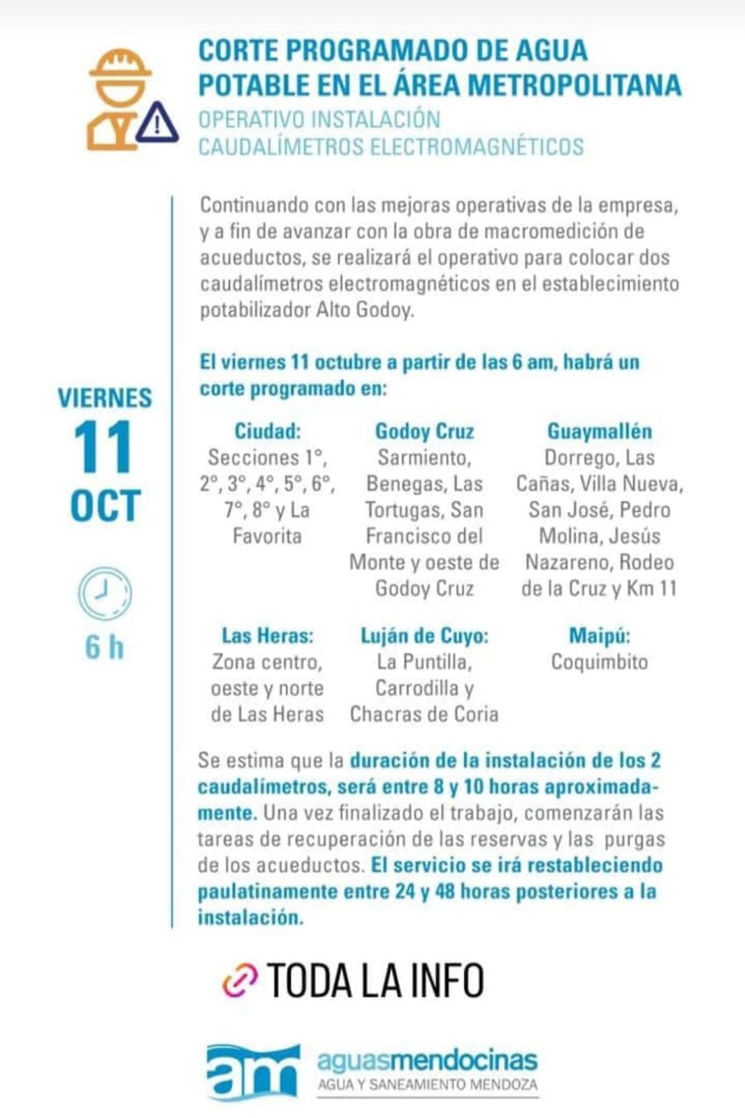 Las autoridades de Aguas Mendocinas comunicaron que un corte programado de agua potable afectará área metropolitano de nuestra provincia, debido a un operativo de instalación caudalímetros electromagnéticos.