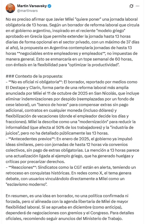 El empresario Martín Varsavsky, quien ha compartido cenas con el presidente Javier Milei, salió a aclarar la fuerte polémica generada en redes sociales en torno a una supuesta reforma laboral que buscaría extender la jornada de trabajo a 13 horas diarias. Según el inversor, la información no es precisa y se trata de una propuesta opcional y negociable, no de una imposición.