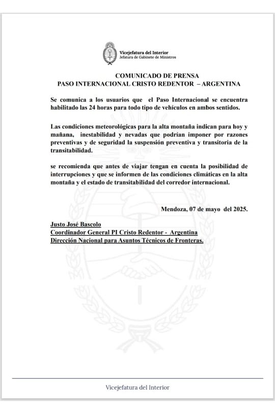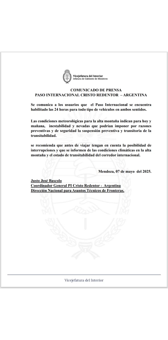 “Las condiciones meteorológicas para la alta montaña indican para hoy y mañana, inestabilidad y nevadas que podrían por razones preventivas y de seguridad la suspensión y transitoria de la transitabilidad”, señalaron.