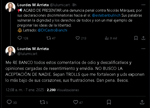 Posteriormente, el escritor lanzó: “Se te conoce no por tu capacidad como funcionario sino por tu enfermedad, que ojalá puedas superar”. Sus palabras no pasaron desapercibida, y fueron varios los que lo cruzaron, inclusive varios simpatizantes libertarios.